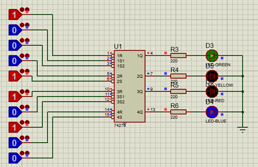 Berdasarkan gambar no 1, misalkan LED BLUE menyala, setelah itu input dari 4R dan 4S di set menjadi logika 1, apakah yang terjadi ?